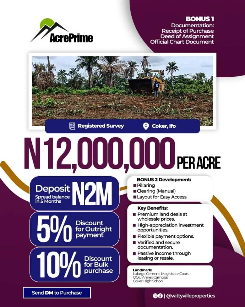 However, If you’re ready to put this knowledge to good use, our ACRE PRIME offer is exactly what you need. ACRE PRIME lets smart investors buy large expanses of land at an affordable rate, with flexible payment options and secure titles. Plus, it’s available in strategic locations across Ogun State, a region fast becoming a real estate hot spot.